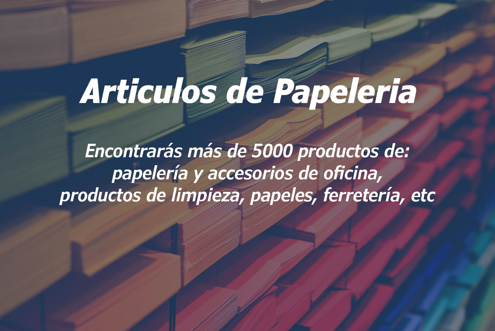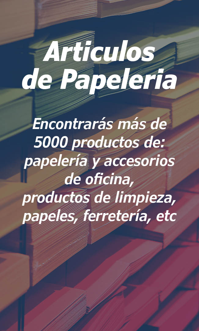 Suministros de oficina: Papelería, Muebles, Artículos de oficina, Cafetería, Limpieza.